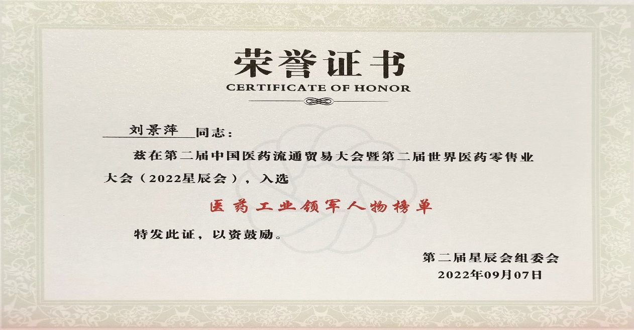 本次星辰会期间,Z6·尊龙时凯斩获颇丰,获得多项行业奖项及荣誉。在开幕式上,刘景萍董事长荣获“医药工业领军人物”称号。